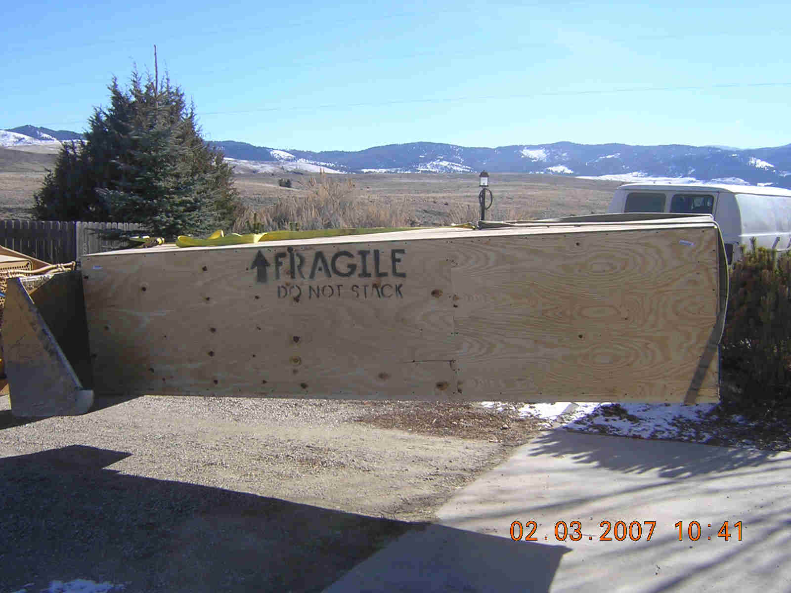 My 601 kit was delivered 2 weeks ago in Zenith's very strong 12x4x3.5' crate. Because I live in the tulles, Yellow said there would be a $70 cordage(?) charge to deliver it to my home address. Fortunately, my neighbor, Mel, has a flat-bed trailer and a backhoe. We picked it up at the Yellow dock in Missoula, where they loaded it onto his trailer with a forklift. It had one hole in it from shipping, but I haven't found any internal damage yet.