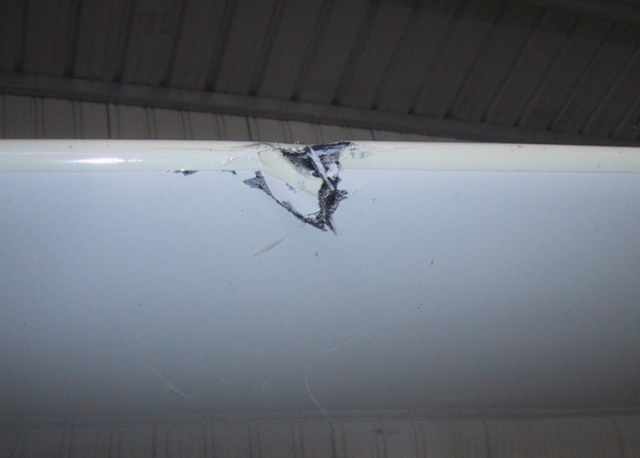 loose from the fiberglass, the strut was broken, and the front hinge was