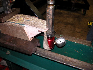 Also visable in the photo is a gauge resting on a loop in the straps with a pressure plate beneath a 2 x 2 steel tube which receives the force from a 20 ton hydraulic press.