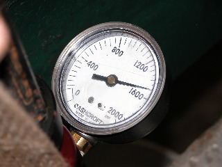 Full Disclosure: My buddy with the hydraulic press uses this gauge to measure the tongue weight on trailers he uses w/ his business...he swears that it measures weight in pounds. However, as you can see in the next photo, the gauge is labeled in psi. You can note the size of the pressure plate in relation to the 2 x 2 steel tube...it appears to be about 2.5 inches in diameter...which means its area is just under 4.9 sq. in. This then implies (to this non-engineer) that the force on the straps would be more like 7359# rather than just 1500#. Could this be so? Help!