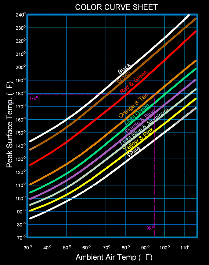 One interesting aspect of the graph is that the color red is not necessarily your friend either (my KFox is currently red) when compared to the lighter colors, although it does stand a clear 20 degrees lower than black.