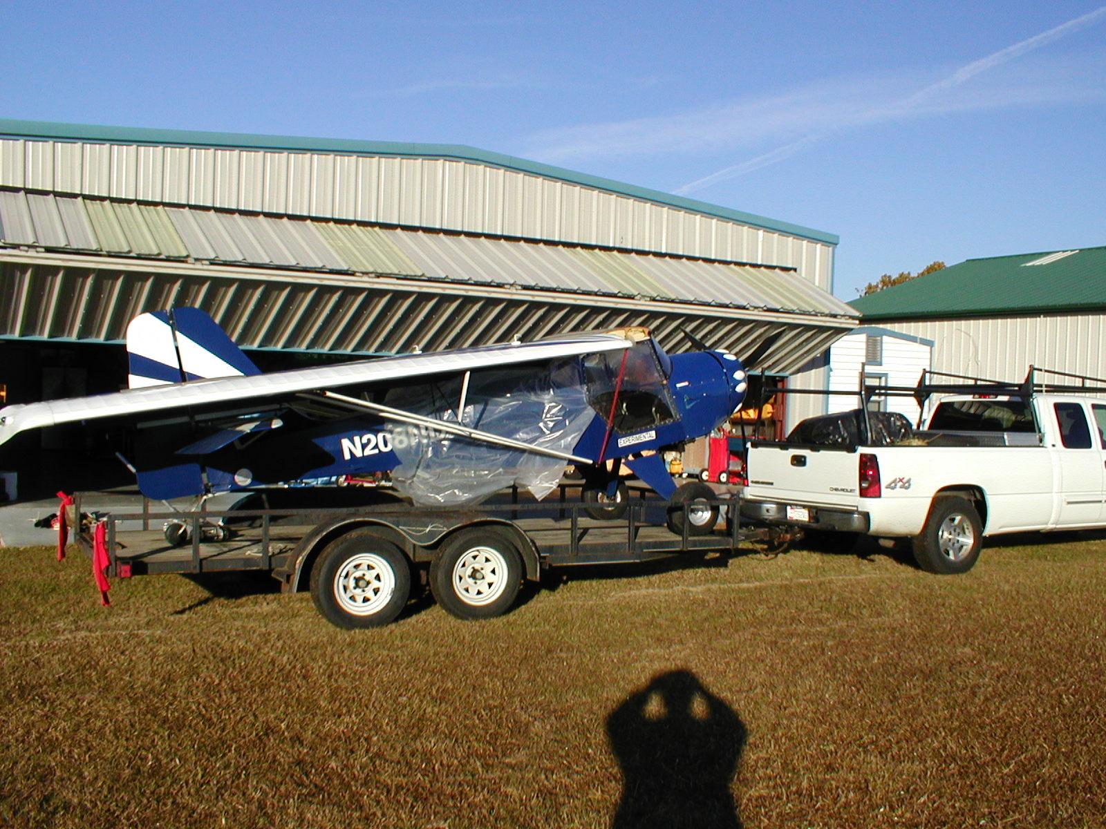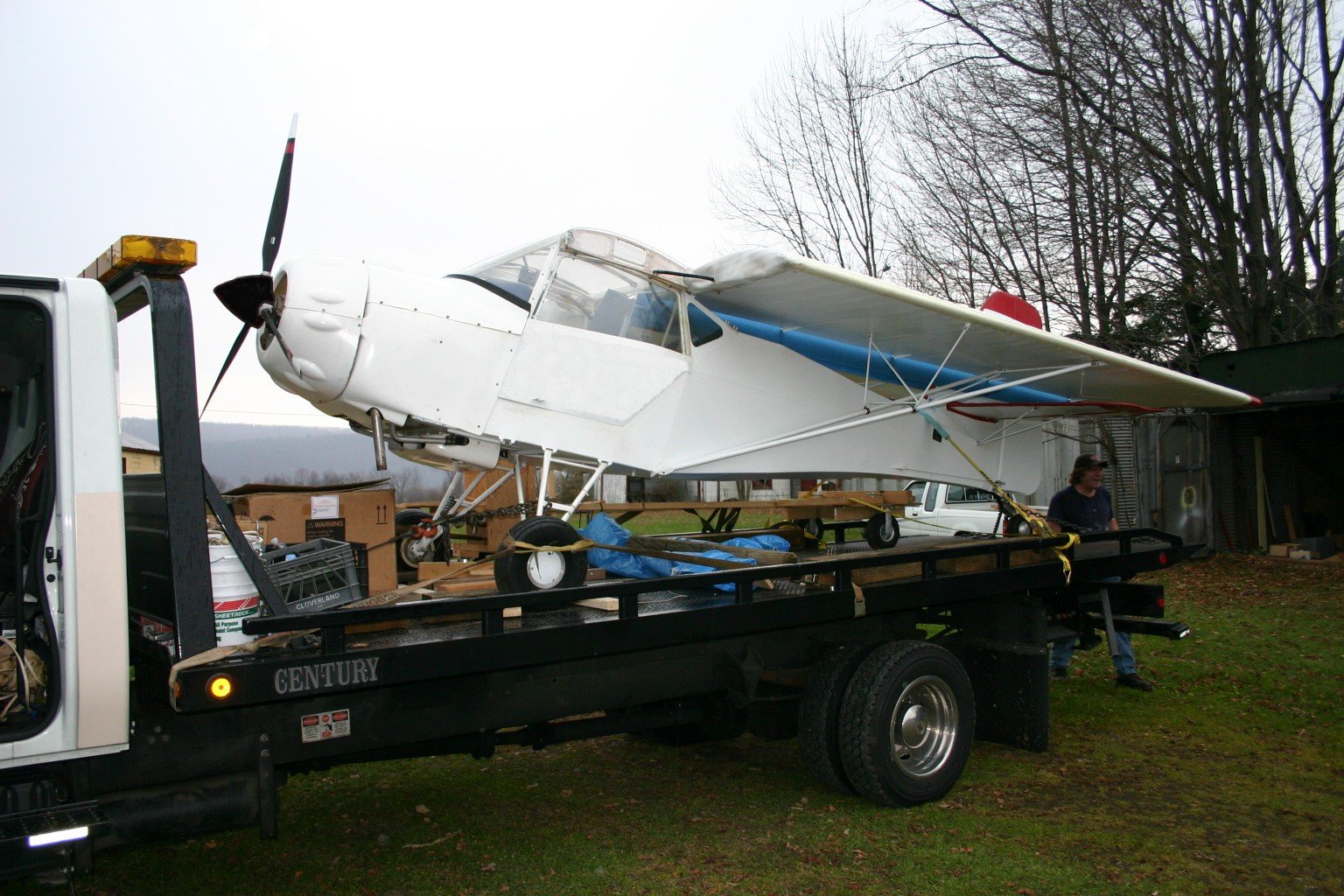 I bought my IV in NY and put it on a Rollback to get it home. It would have been nice to have a brace on the unsupported part of the wing. I was trying to beat the rain back so I bumped it up to 70 mph so that it did not get wet and made it just fine. It only had 2 gal of fuel. I pulled it on by the tube gear with the "Y" chain (see Photo) and one attached to the Scott tail wheel. Then put a strap over the tail just in front of the fin with some blue foam in a roll used for construction. I strapped the 2 front wheels and tied the stick back. I also put foam over the ends of the wing so it did not fill with air. All went off with out a hitch but would have liked to move it in a enclosed trailer next time. What a great first plane to learn on.