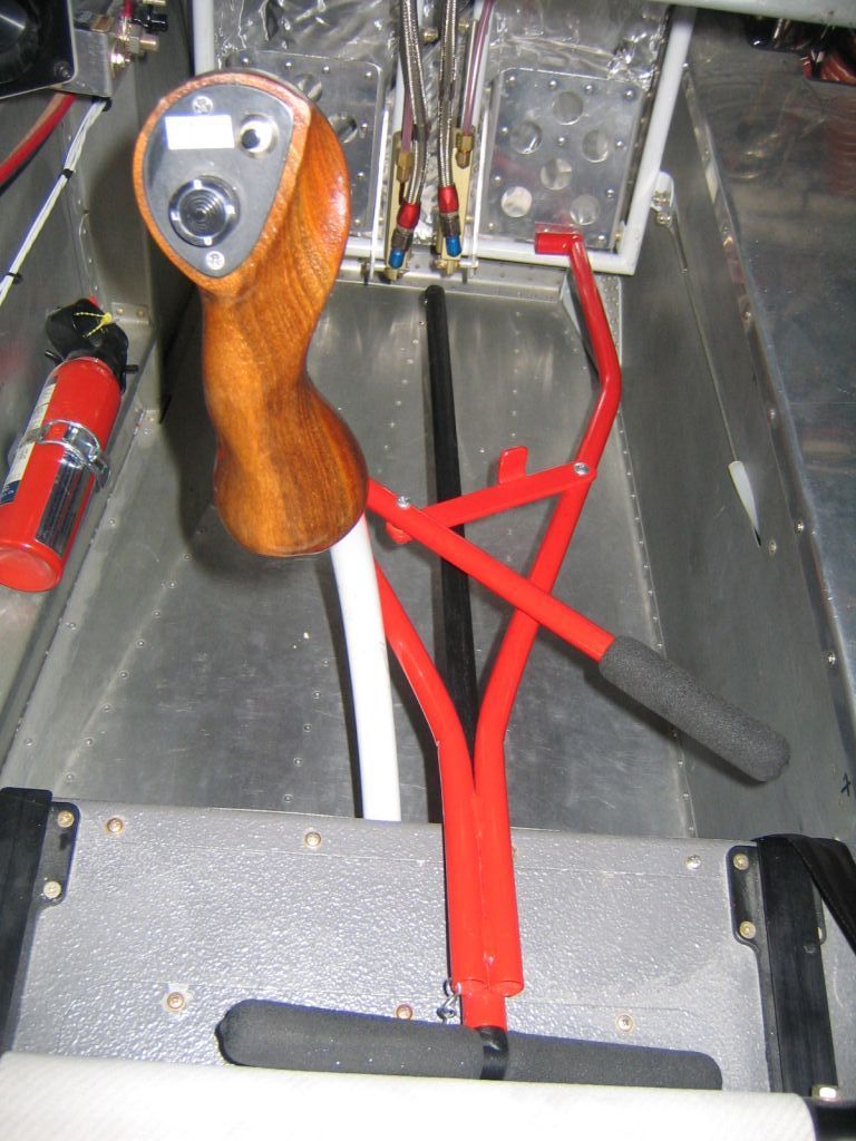 We do something very similar, except when we trim the horizontal tubes to allow the towbar to fit around the nose wheel pant, we weld those onto the front of the towbar so they fit in the holes in the pedals. Then we usually leave the handle extended and up against the back of the seat and put the seatbelt up and over it to hold it down. Sometimes we put the stick up through the middle of the "Y" and then use the other seat belt to hold it back which holds the ailerons, elevator and rudder. It takes some time, but seems to work quite well. You can get a little play in the rudder, but not nearly enough to hit the stops. We've been happy with it this way so far.