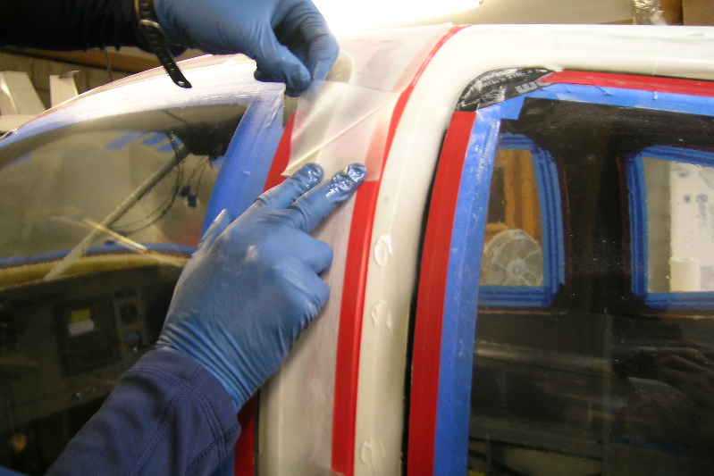 Peel back the backing plastic and transfer to the plane. Once on the plane, remove the top layer. Use the brush to work the edge of the cloth to the tape line.