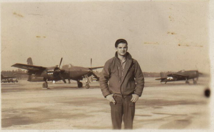 dad at the end of WWII. What is the twin behind him? NO FAIR LOOKING