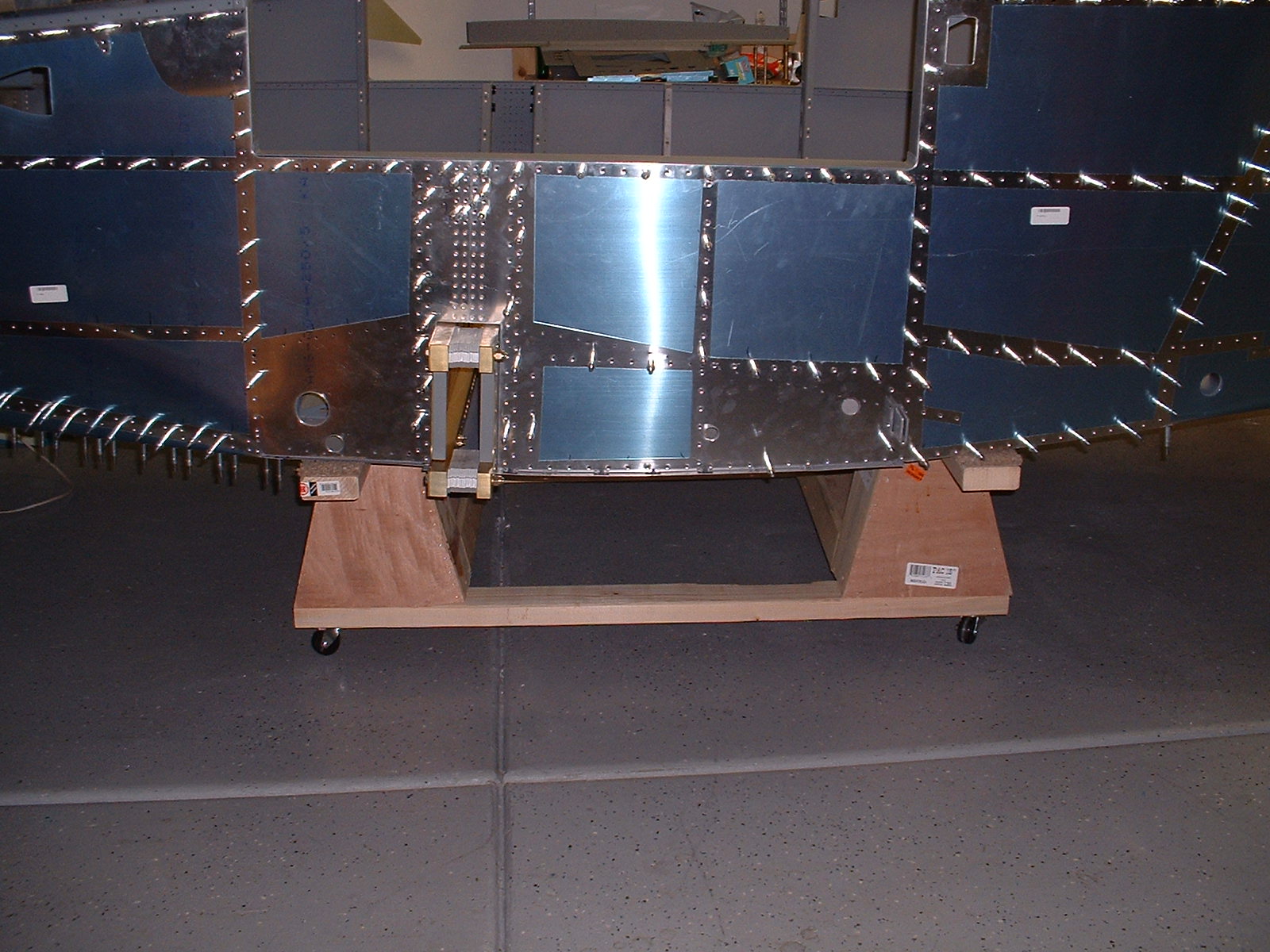 I bolted on a set of tires using 2" aluminum angle. It allowed me to roll the fuselage in and out of the garage. It turned to to be about a good height for me to reach over the top longerons to work.