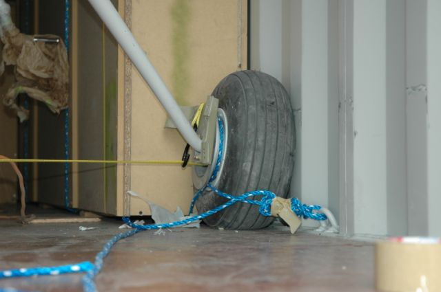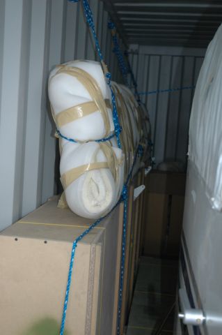 Since we’re on this subject, here’s a couple of pictures of our “truck” packing.  Everything was in crates except the fuselage and HS, then very well secured several ways.  The width of the gear was a press-fit into the container, but it did fit.  We just lifted it up and in, but ramps would be nice also if you can keep them from sliding or falling off.