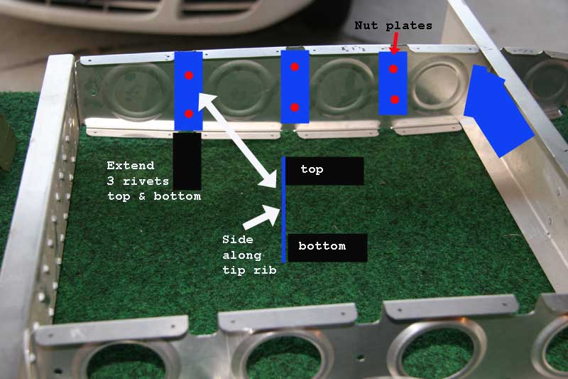 Then, to reinforce the front and rear tip rib attachment points to the main and rear spar, I'm going to put in short .040 angles like the one big blue area on the right of the picture (I know, graphics isn't my strong suit).