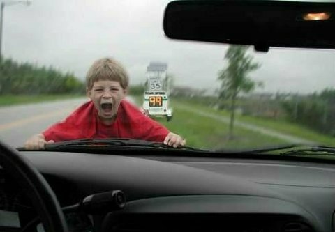 That kid must have really bad luck. I saw him last year on the hood of his grandmothers car. I think he is still holding the windshield wiper in this photo.