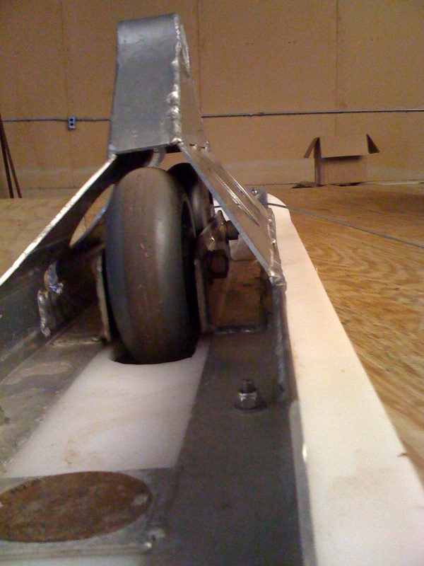 I used a garbage can lid to trace an arc to a piece of wood that looked about right. I then took the wooden template and traced it to one side of a piece of aluminum angle that is the ski portion of the frame. I cut the piece out, then bent the bottom of the angle to match the arc and welded it. It could be low, but other store bought skis are about the same. I then cut the scrap off, and welded a cross piece in.