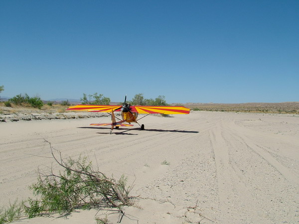 Here was another occassion to use the "flap pop up" technique of takeoff. Was between LA, CA, and Laughlin, NV. In dire need of a pit stop. Nearest airport 30 miles off course. Picked out a dry creek bed, drug it twice, then went for it. Sand was dry and deeper than I had expected. Thank goodness for the displaced main gear on my MKIII. Standard MKIII gear location would have put me on my nose and I would have been looking for another way back to Alabama. In a situation like this, there is no way to know exactly what you are getting into until you have committed to land. I was a little bit, well..........a lot leary, of getting back out of there. Walked my take off track to make sure there wasn't anything that was going to jump out and bite me. Big problem is getting the aircraft to start rolling. I also had dug out in front of the mains to help every little bit I could to get moving. Once I got her rolling, she climbed right up on top of the sand, popped the flaps, and we were flying. That is always a super good feeling when we get back in the air once again.