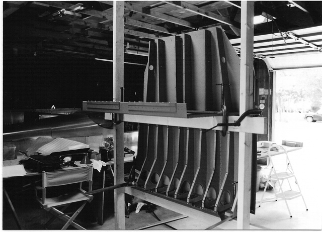 For the tailcone (RV-10), it was quicker to just set up a ladder and use the tail hook to secure it, Put some padding on the ladder. The bottom skin (J bars) had been completely back riveted before it was assembled into the sides and tops. Leave room at the floor to get inside. See the feet of person inside! The very aft end was finished by putting the tailcone on some low saw horses. In the pictures, the skins aft of F109? are still clecoed.