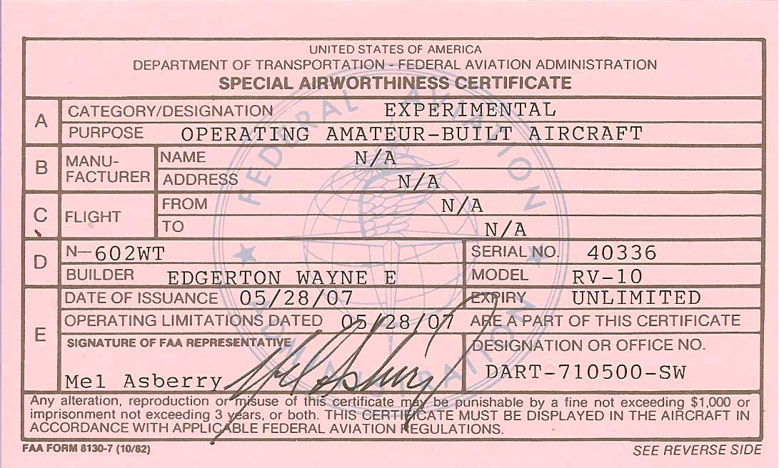 Well I had my DAR inspection today and luckily for me it went through without a hitch. He found a few little items but nothing of any consequence. It feels great to be past that junture and I'm ready to move onto the fly off stage. I had a couple of other 10 builders and a 7 builder stop by the hangar during the inspection to take notes for when they are ready :>}