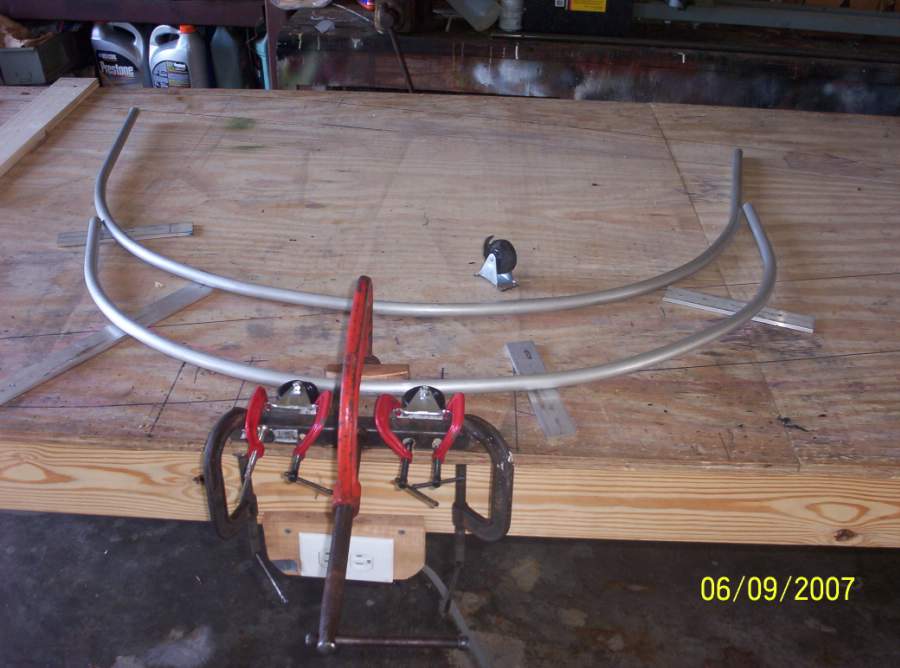 Thanks to Larry and Craig the duty is performed .Finished bending the tubes today .Packing with sand helped a lot & starting from the center and working outward also worked well .I used Larry's C clamp method .Took most of the day however I think that another set could be made in a couple hours . Note wrecked wheel in photo . Thanks to a great group of people on this site . Wade