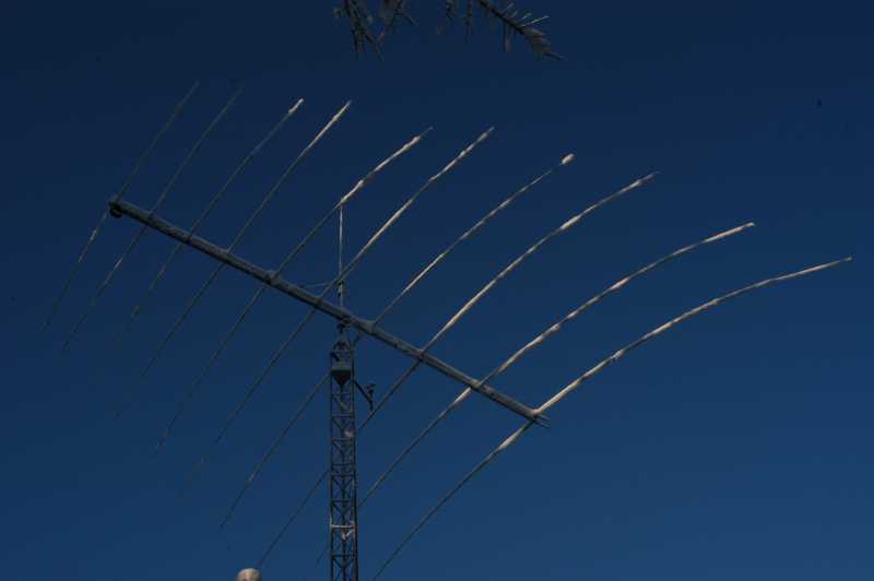 The vertical antenna on the top is a tri-band 2m, 6m, and 70cm and encased in fiberglass (15ft. tall); The main antenna is a log periodic 13-33MHz - As for scale, the boom length is just over 30 feet, longest element is 32 feet.