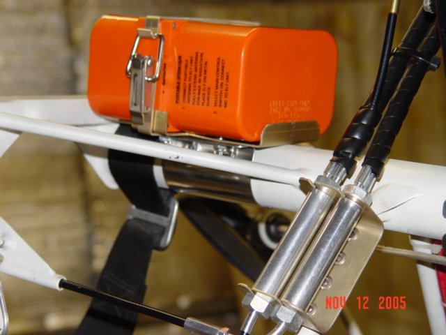Here is where I mounted my ELT. I made a bracket to hold it on the top of the tube, butting it up against the front wing attatch bar. This is in a Firestar, and I was just out of room. I mounted the remote on the right side of the nose cone.