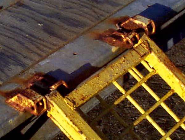 A close up of the cleats I welded to the trailer. 5/16 bolts hold the ramps to the trailer and form the hinge. I also had a temporary block behind the hinge on the deck for towing the trailer with the ramps in place but without the plane.