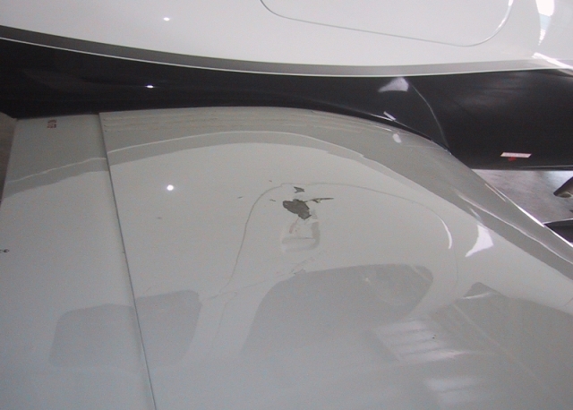 loose from the fiberglass, the strut was broken, and the front hinge was