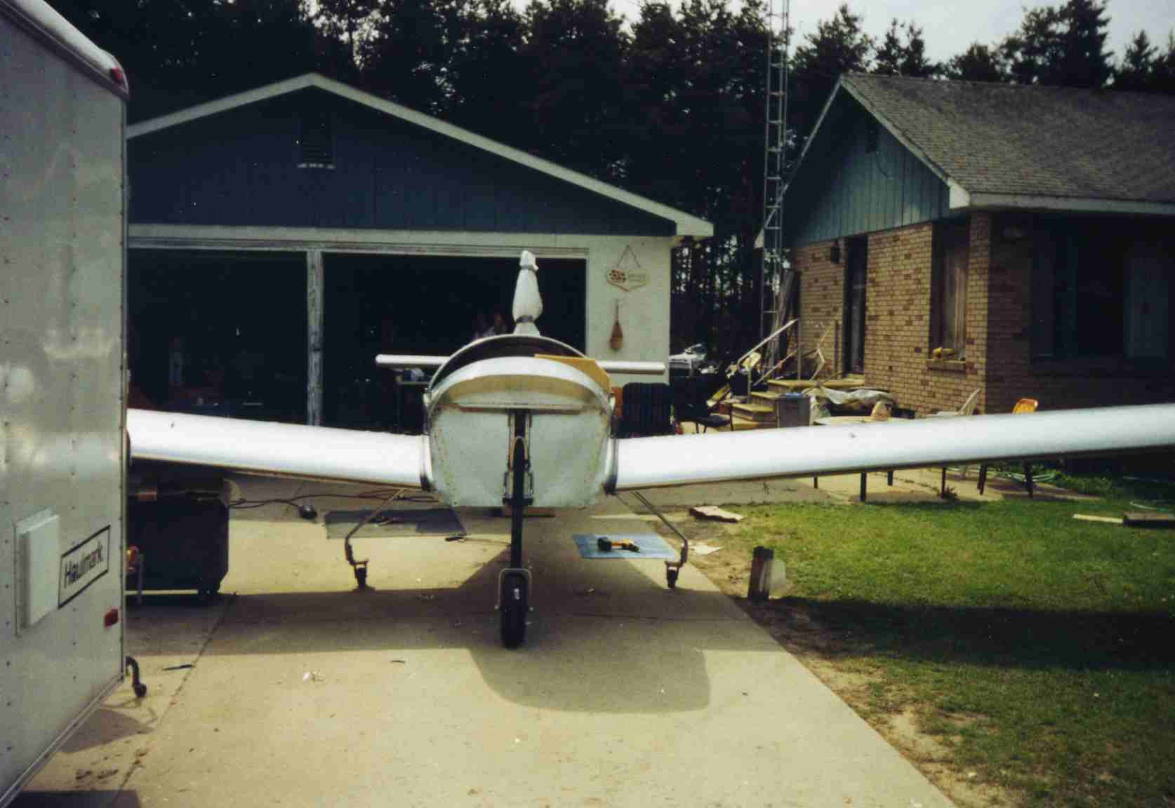 I had a 24' Haulmark trailer that I built the plane in and used it to transport the plane to the airport for final assembly. I had to leave the fiberglass stabilizer tip fairings off because the stabilizer was too wide to fit through the door otherwise. The fuselage fit in the trailer just fine with the main gear installed and the nose facing the rear. When I mounted the engine, the engine would extend past the rear door so I had to put the plane in nose forward. The distance between the wheel wells was just a bit too narrow for the main gear with the wheels installed. I managed to fit the pane in the trailer by removing the main gear axles and installing a pair of tool box wheels mounted to short pieces of angle iron that I bolted to the inside of the main gear spring. Then I just wheeled the fuselage into the trailer. I had to put a ramp for the nose wheel to raise it up in order to lower the rudder below ceiling level. With the tool box wheels installed, the fuselage just happened to sit at the same attitude it did with the main wheels installed.
