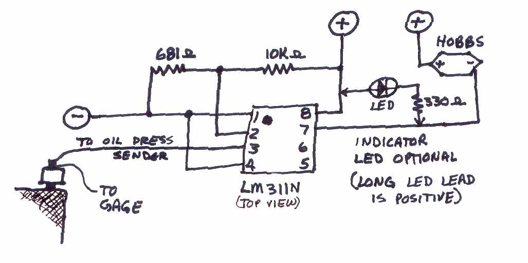 The chip is your basic comparator, LM311N (Jameco has them for 94 cents). The two resistors determine the voltage (oil pressure) where it will switch. This simple circuit may also be used for alarms or warning lights for other functions.