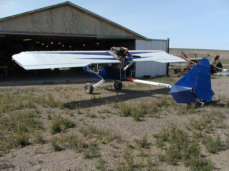 Well I have finally breathed the last of the paint fumes again. Perhaps this headache will finally go away. My mask leaks when I wear my glasses and I can't see very well without them, therefore the 50 foot paint job. Looks pretty good at 50, but the flaws show up when you get closer. Not to mention its too darned dark in the hanger. What ever! It is kinda straight and is recovered, and repainted and now it has wheels and legs that will not let me down again. Not to say that I can't screw it up but at least it won't be because a part let me down. Now I need to get the instruments back in and hooked up so that I can do some tests and find out how it performs with longer legs. I am sure happy with the alignment this time. I set a bit of toe in on my last legs and when I pulled it backwards out of the hanger they would spread and it was hard to pull. Forward it caused the legs to stand up more. This time I set them straight, and during the axle change found that the brake drums were dragging on the backing plate for the shoes. Now it pushes both directions so easy and seems to track straight as well. I had to really push it to get the painting done. The weather here has been really iffy at best. Just a few days every now and then that were warm enough to paint. Today was about 75 so I really pushed the envelope a lot. There was a high wind warning today as well, tomorrow will be the start of a downward trend that will take us down to the 50's for a week or so. Hopefully the weather will get it over with and be nice for a change.