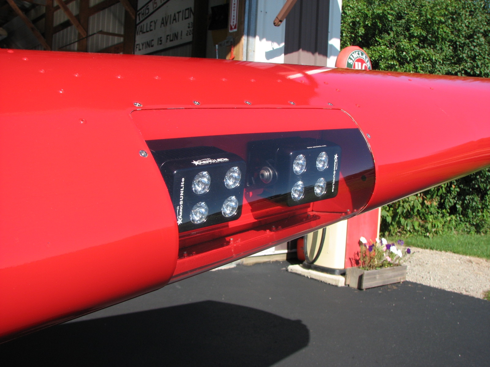 Like Rick said "This sounds like a commercial", but it's not. While at the show in Oshkosh I was looking at all the different light set-ups. I bought two LED lights (4 LED's per), one for landing and one for taxi. (SEE PICS Attached) I did not buy the one with 8 LED's because I have to set them at two different angles. Because of the hight nose angle of the HDS during landing I set one with a slight down angle and the other level to the ground for taxi. With the old set-up I would use one light at a time, but with the new LED's they are both on at once. The old lights would draw about 8 Amps. each and the new ones draw 9 tenths of an Amp. With both on at the same time they are brighter than one of the 4509's. The beam of light is much wider than the old ones so even the taxi light set level works as a landing light. I did not run any more wires to control the new lights. The switch I used for my taxi light is now used to control both lights in their Wig/Wag mode. The company I bought from is called AeroLEDs http://www.aeroleds.com/. "What a difference in current draw".