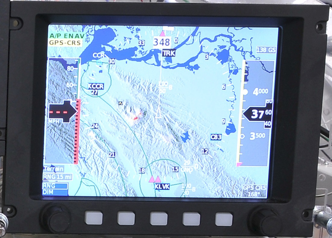 The panel on the RV-8 got the first power up today. I interconnected all of the major instrument panel devices to the Vertical Power VP-200 electrical system and powered everything up. In the center screen, you can see Mt Diablo in California. I was playing back a flight from a portable GPS I use in the rental plane. Notice the top of the mountain is RED which means that its above our current altitude (from the playback). The Kenwood is playing a James Bond movie...