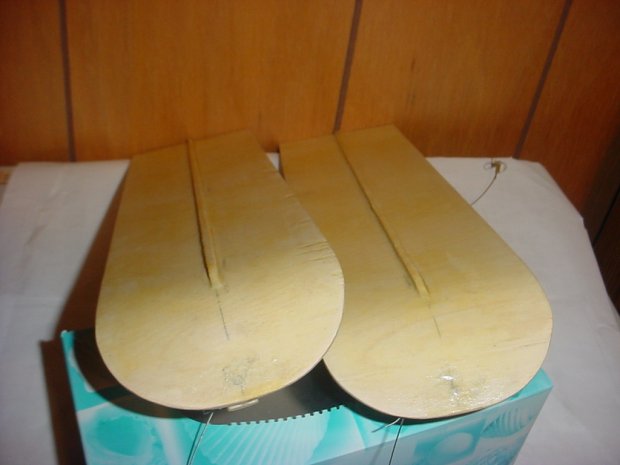 There is a left and a right ski. We used to do that when we were building skis for our RC models. The pedestal was always higher on the inside and canted the ski up about 10 degrees on the outside edge. In the enclosed photos from my 15 lb Beaver the skis are 3" wide and 14" long. I used 1/8" plywood and sanded to nothing on the outside edge of the pedestal. Also used a 1/8" x 1/8" spruce spine on the bottom for directional control. My tail ski was 3" long and 1-1/2" wide with the 1/8 x 1/8 spine also...