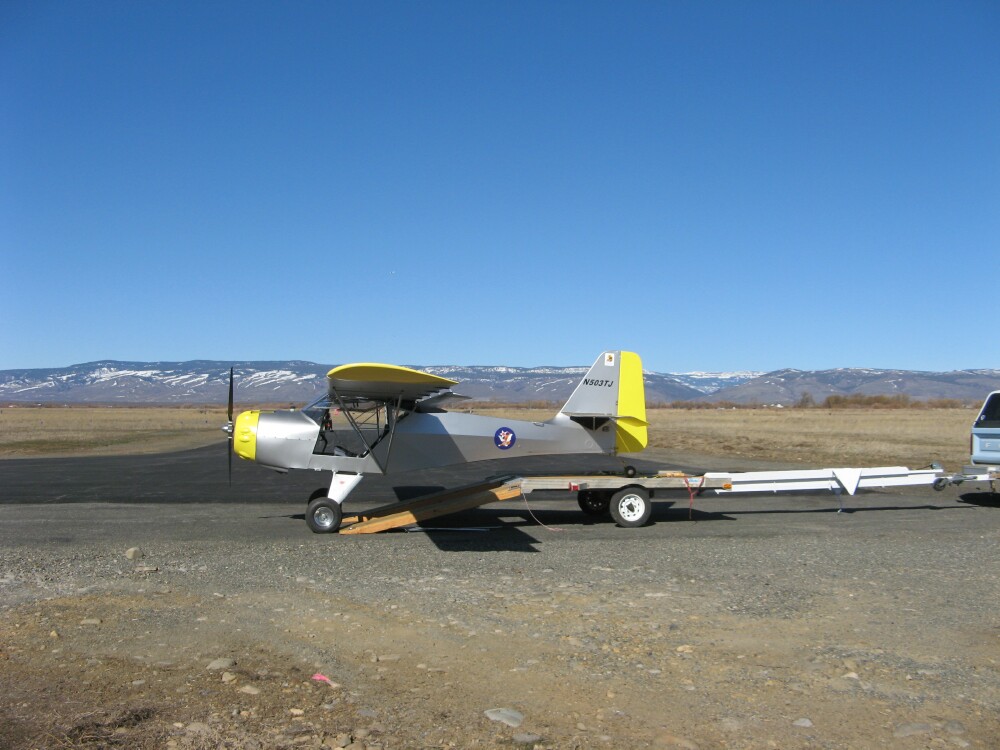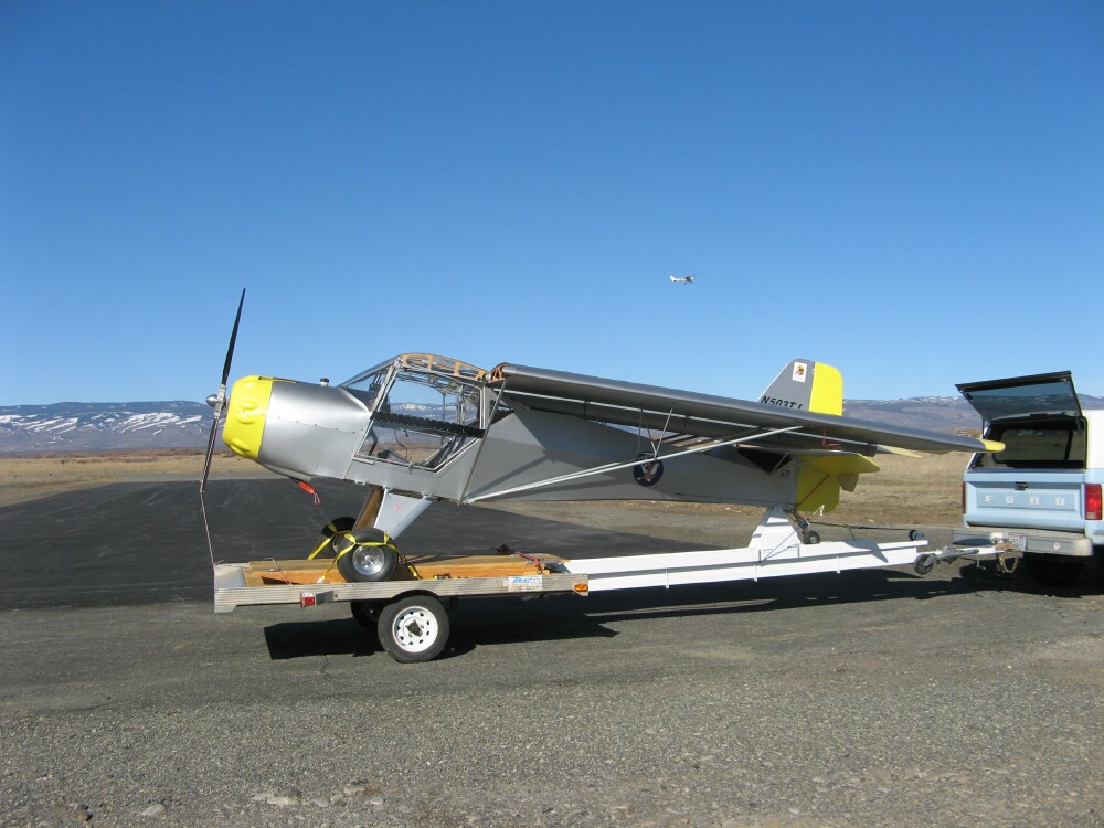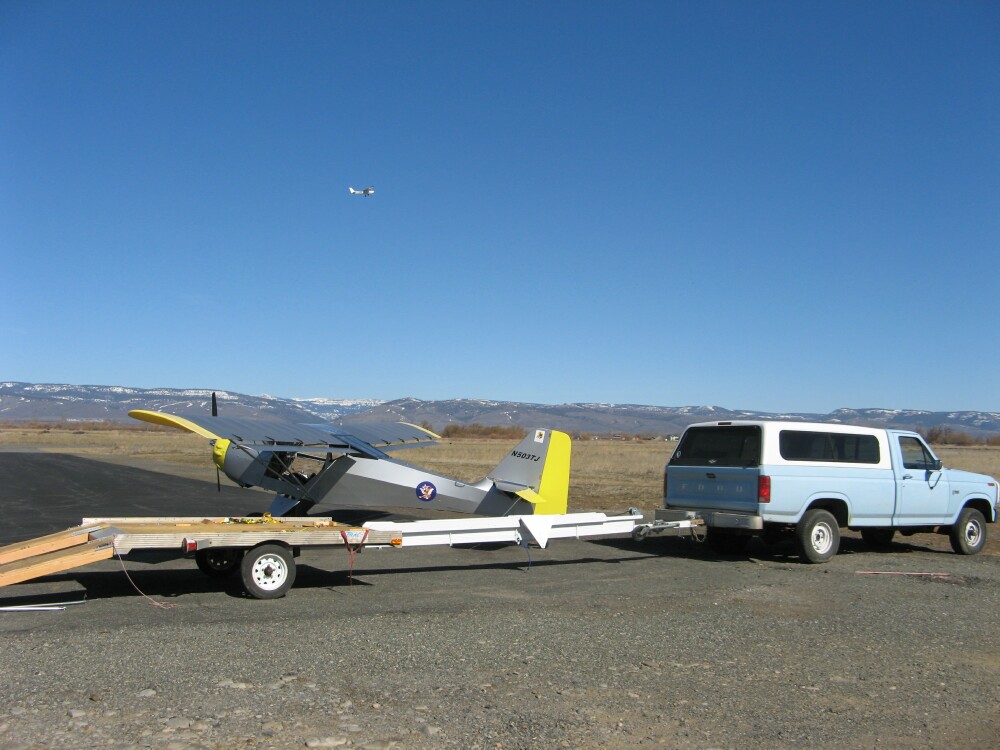 It is an old two place snowmobile trailer. I replaced the tongue with one 16 feet long. There is a little hand crank boat winch on the front of the tongue to crank the Kitfox up onto the deck. I set the tail on the deck before folding the wings.