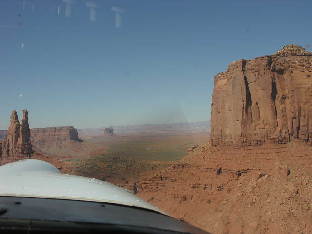 On the ride with Dave in his C-175, we went between 2 of the spires, or "monuments" on the way back from Mexican Hat. This looks pretty impressive - and it was - but don't get too excited about risk. We were at least 500 ft agl, (these things are ~700 ft high) and the spires were more than 100 yards from each wingtip. The telephoto lens makes 'em look very close, but it was plenty exciting as it was.