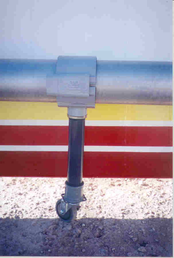 Erics boom tube dolly is a plastic irrigation  Saddle that fits the 6 inch pipe and has a 2 inch pipe thread outlet….  When in the trailer it is attached to some type of attachment that goes to the floor of his trailer…  during loading and unloading he screws a wheel into the pipe thread attach point….  To try and find the saddle I would try a sprinkler / irrigation  supplier.